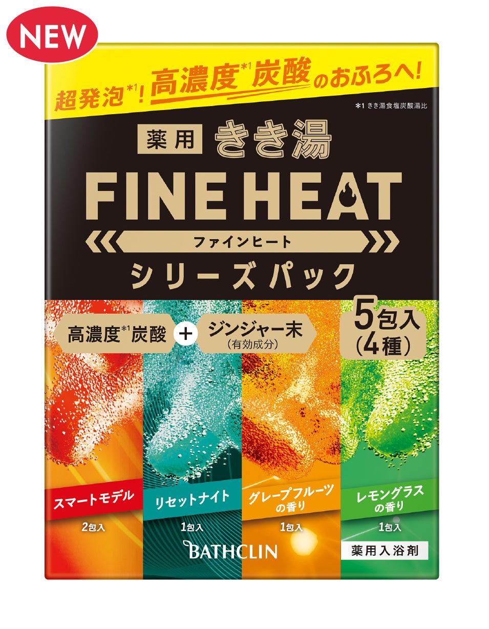 「きき湯ファインヒート」シリーズは、ツブが勢いよく発泡し、高濃度*1炭酸ガスがすばやくお湯に溶けこむことで、炭酸ガスの効果をよりスピーディーに得られる入浴剤として、多忙なライフスタイルのお客様にご好評いただいております。このたび、「きき湯ファインヒート」シリーズより、気分にあわせてアイテムを使い分けたり、自分のお気に入りのアイテムを見つけることができる「シリーズパック」を8月8日に新発売します。