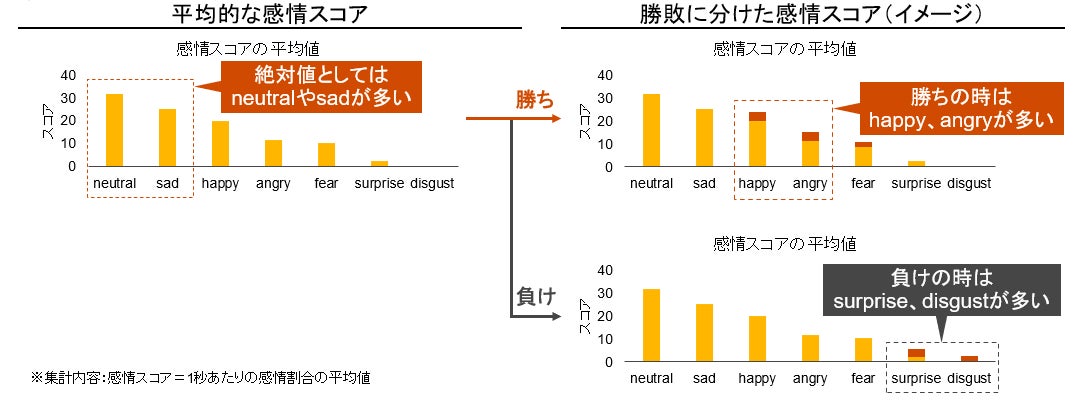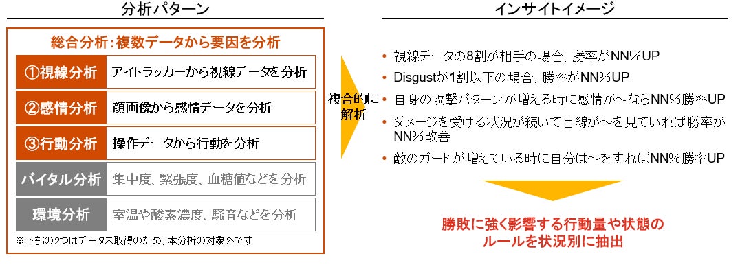 視線分析、感情分析、行動分析など多角的な要素を組み合わせ、どの要素が特に強く勝敗に影響するかを決定木分析(統計手法)にかけることで、定量的に把握することができます。