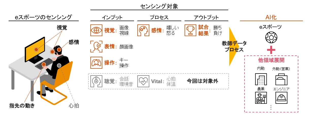 視覚、表情、操作データをインプットにパフォーマンスとの関係を探り、eスポーツ のAI化を進めます。また、本AI化のプロセスは、他業種への展開も視野に入れています。