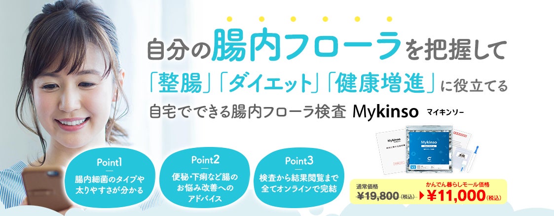 「マイキンソー」は、自身の腸内環境を簡単に可視化することで、自分の生活習慣やライフスタイルを考えるきっかけとなるサービスです。ご自身の「腸内フローラのタイプ」や「太りやすさ」がわかったり、「腸内フローラから見た便秘や下痢のタイプ判定・改善アドバイス」を受けたりすることができます。