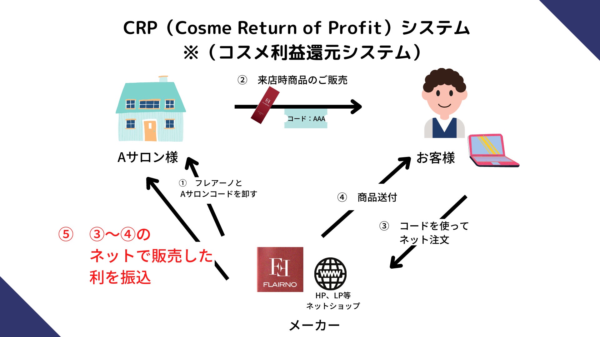 CRPシステム(コスメ利益還元システム)とは、サロンに来たお客様に直接商品を販売できなくても、後日お客様がネットで購入した際にその利益の一部がサロンに振り込まれるという方式。