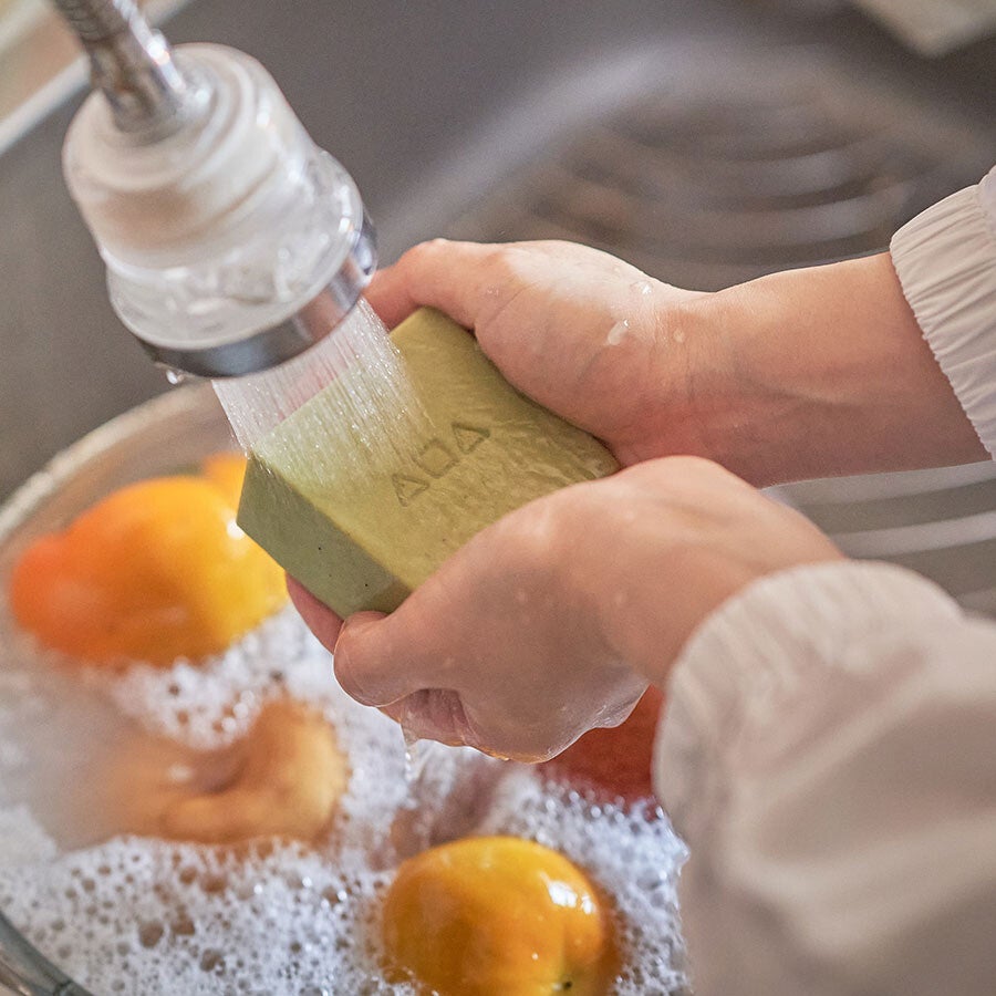皿洗いにはもちろん果物や野菜洗いまで幅広く使える固形の食器洗い洗剤。ハーブオイル配合で素手での食器洗いにも手荒れの心配がないため、安心して使える。190g 1,200円