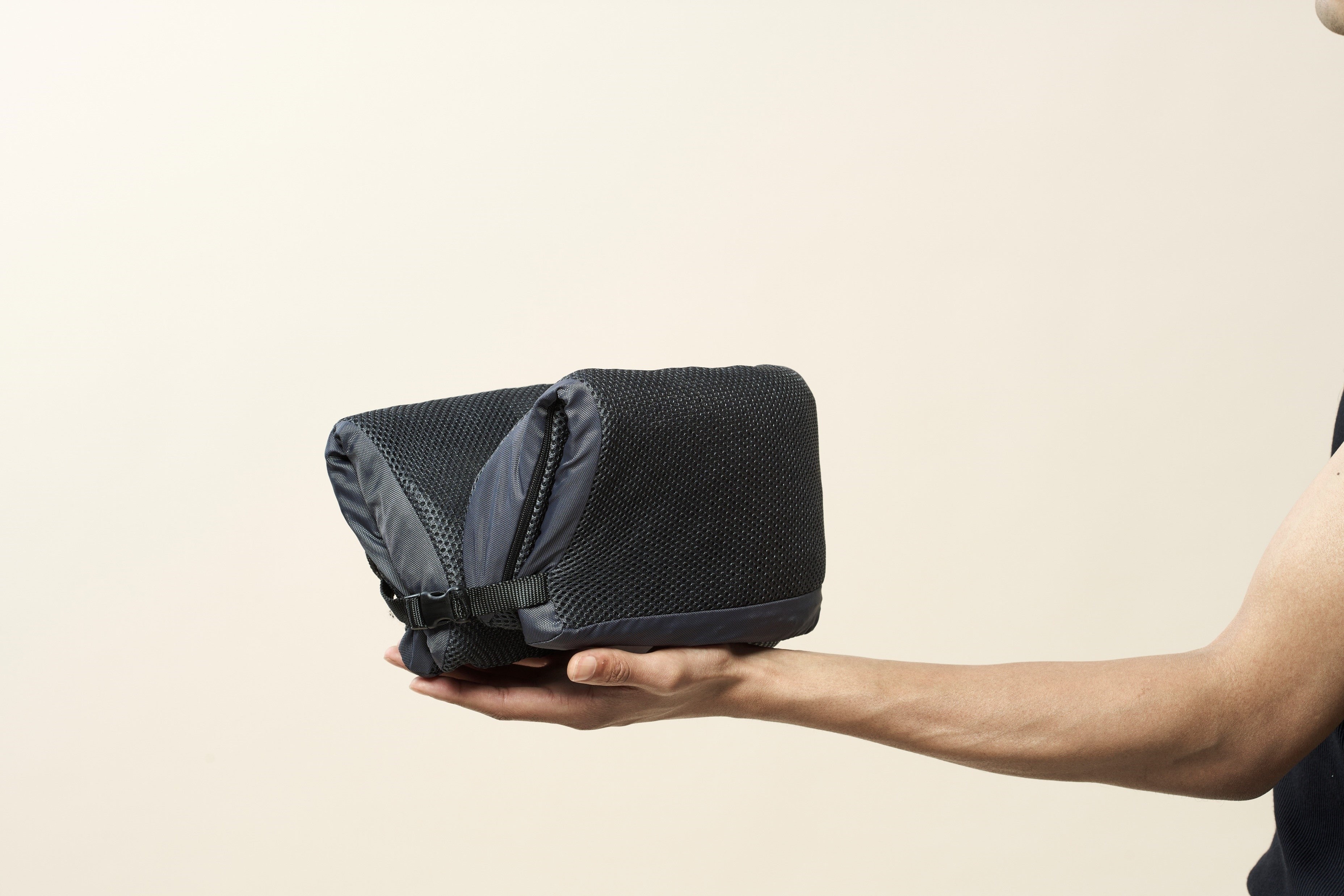 コンパクトに畳めて、スーツケースに取り付けてもスマートです。体積の90%以上が空気のため重量はわずか210gと超軽量で移動中も軽快です。