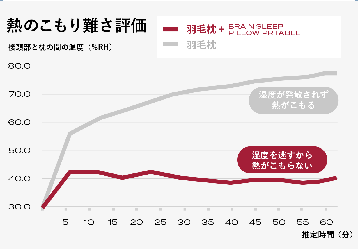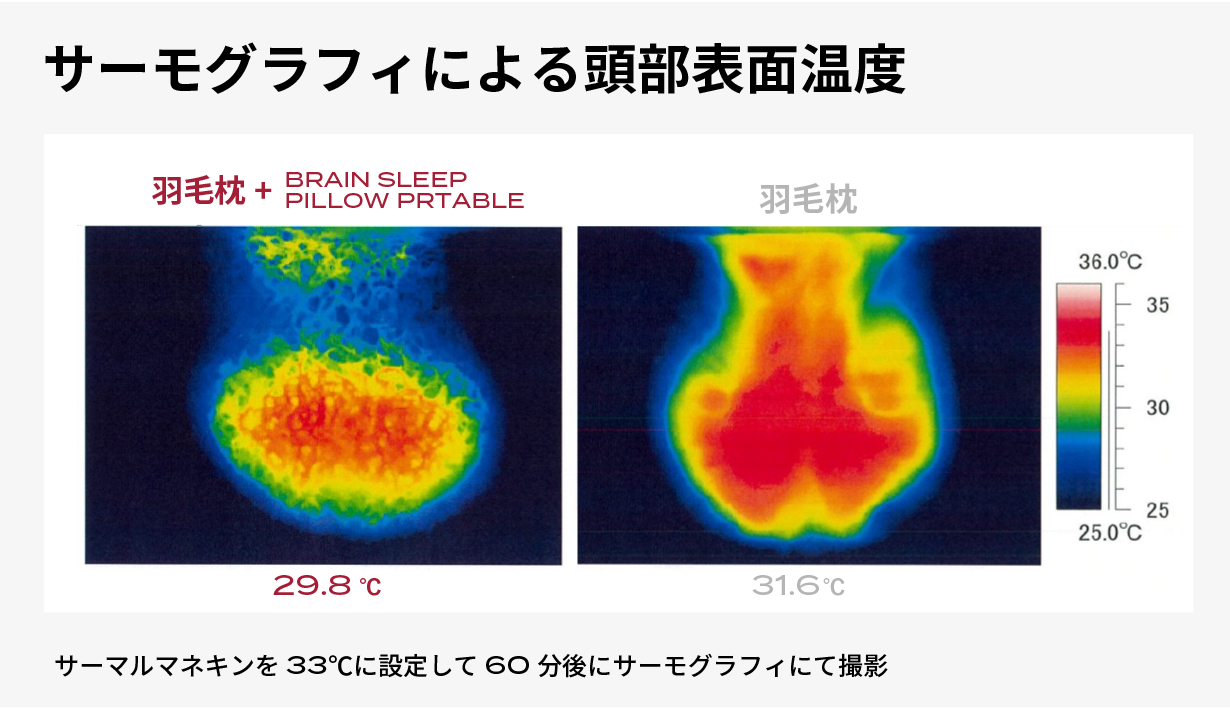 一般的なホテルの枕は、「ふかふかして気持ちが良い」というイメージとは裏腹に、首が沈み込みやすく熱がこもりやすい材質であることが多く、寝付けない原因の1つになっています。BRAIN SLEEP PILLOW PORTABLEは枕の上に敷いて使う事で睡眠時に発生する熱や湿気がこもりにくく、出張先や旅先の枕でも快適に眠ることが可能に。サーモグラフィで頭部の表面温度を羽毛枕単体と比較してみても、約2℃低い結果が得られています。