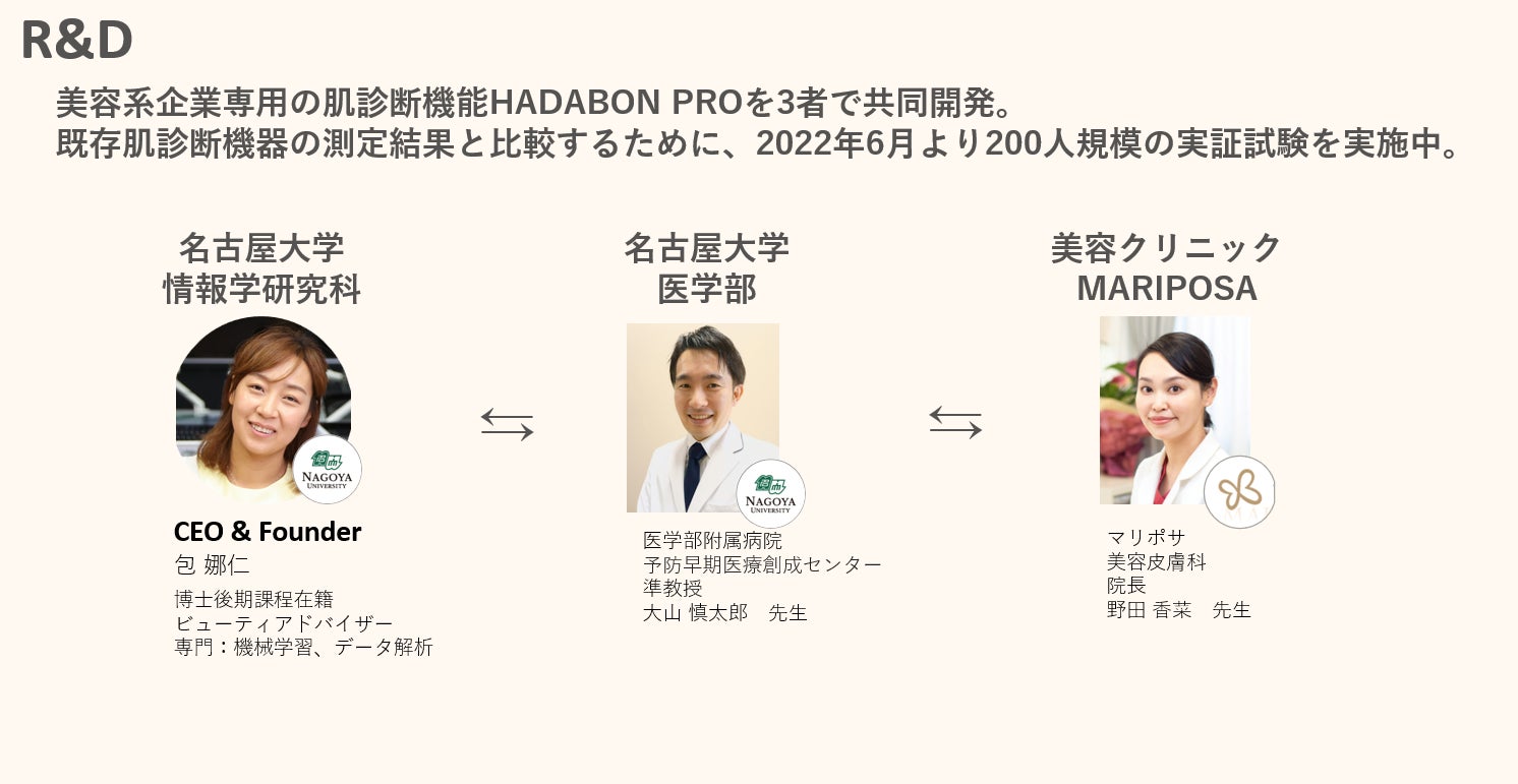 美容系企業専用の肌診断機能HADABON ProをAquaAge株式会社、名古屋大学医学部及びマリポサビューティークリニックの3者で共同開発。既存肌診断機器の測定結果と比較するために、2022年6月より200人規模の実証試験を実施中。