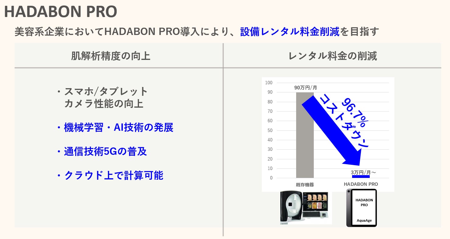 HADABON Proにおいて、設備レンタル料金削減だけではなく、今後HADABONアプリとの連携集客で売上向上及び美容系企業向けDX化サービスのご提供で業務効率化を図ります。
