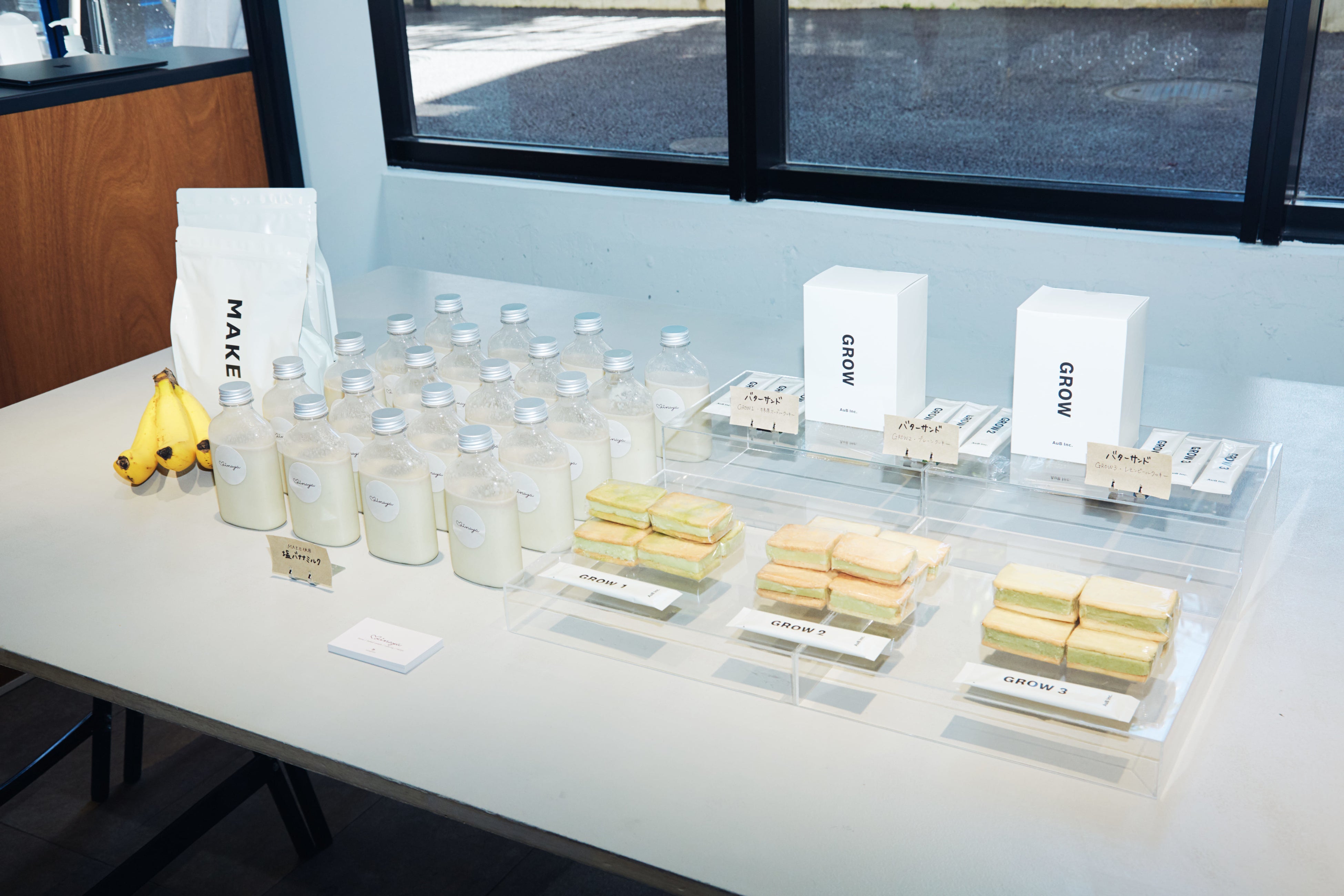 ゲストの浅野美奈弥さんが代表を務める「美菜屋」によるAuB商品を使ったドリンクやフードを用意し、「夏×おいしい腸活」をテーマとした腸活レシピの試食会を実施いたしました。今回は食物繊維ミックスAuB GROWを用いた「GROWバターサンド」、マルチ栄養プロテインAuB MAKEを用いた「MAKE塩バナナミルク」を参加者の皆様にご試食いただきました。