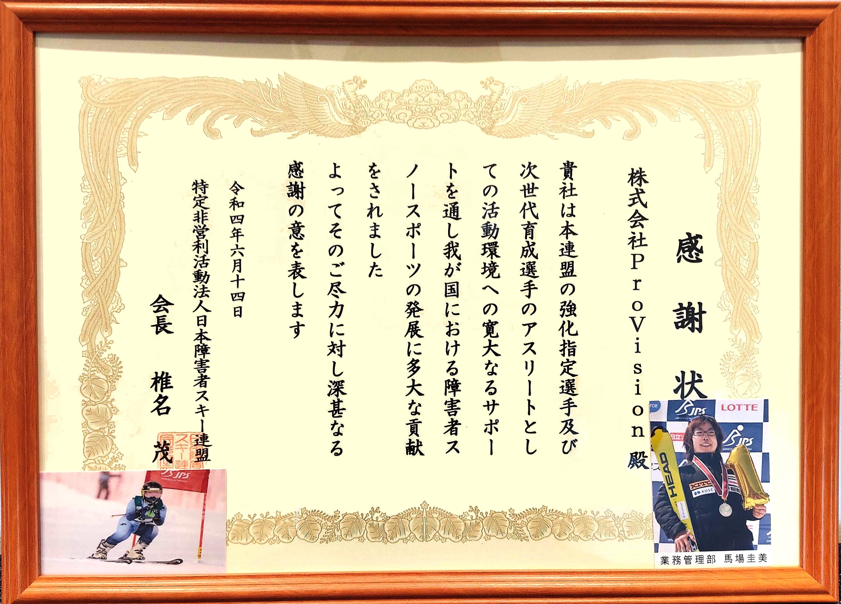 ProVisionアスリート社員として活動する馬場選手は、2021年より日本障害者スキー連盟強化指定選手に選出されています。この度は日本障害者スキー連盟より、ProVisionが馬場選手の競技活動や仕事環境へのサポートを通じて、障がい者スノースポーツの発展に貢献したとして感謝状をいただきました。