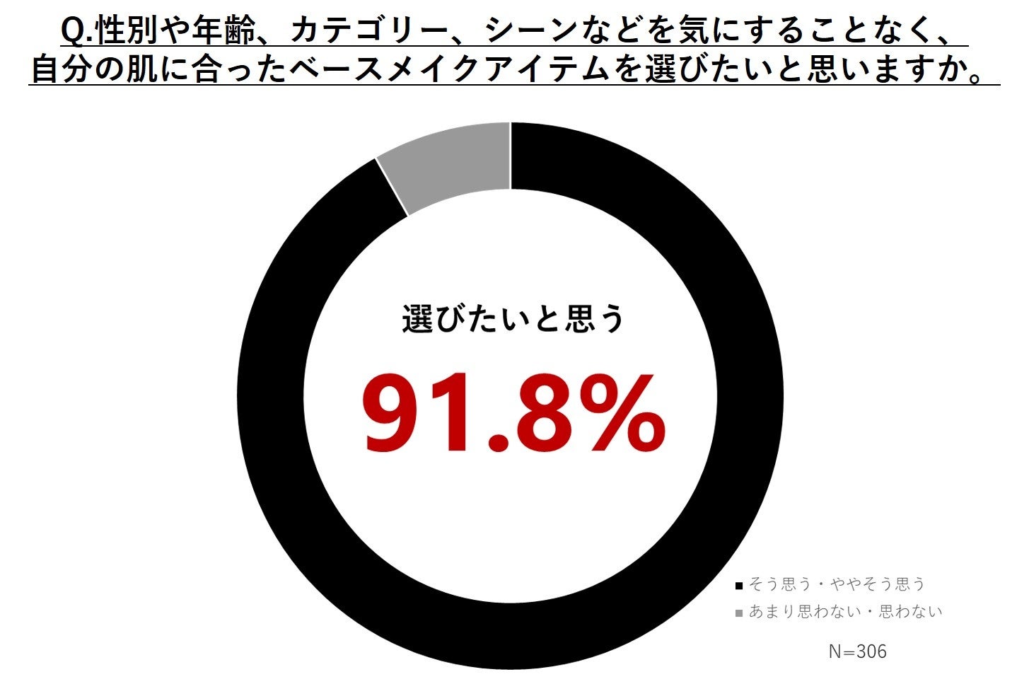 ベースメイクアイテムについて、全体の91.8%が性別や年齢、カテゴリー、シーンなどを気にすることなく、自分の肌に合ったベースメイクアイテムを選びたいと回答しました。また、男女別においてもそれぞれ9割以上が自分の肌に合ったベースメイクアイテムを選びたいと考えていると回答し、これらの調査で紐解いてきた性別問わず⾃分の肌に合ったものを選びたい「ジェンダーレス」、カテゴリーにとらわれず1本で手軽に⾃分の肌に合ったものを使いたい「カテゴリーレス」、⾃分の肌に合っていれば様々なシーンで使い回せるアイテムを選びたい「シーンレス」を踏まえ、ベースメイクにおいて様々な境界を取り除いた「ボーダーレス」という新しい考え方が求められていることが分かります。