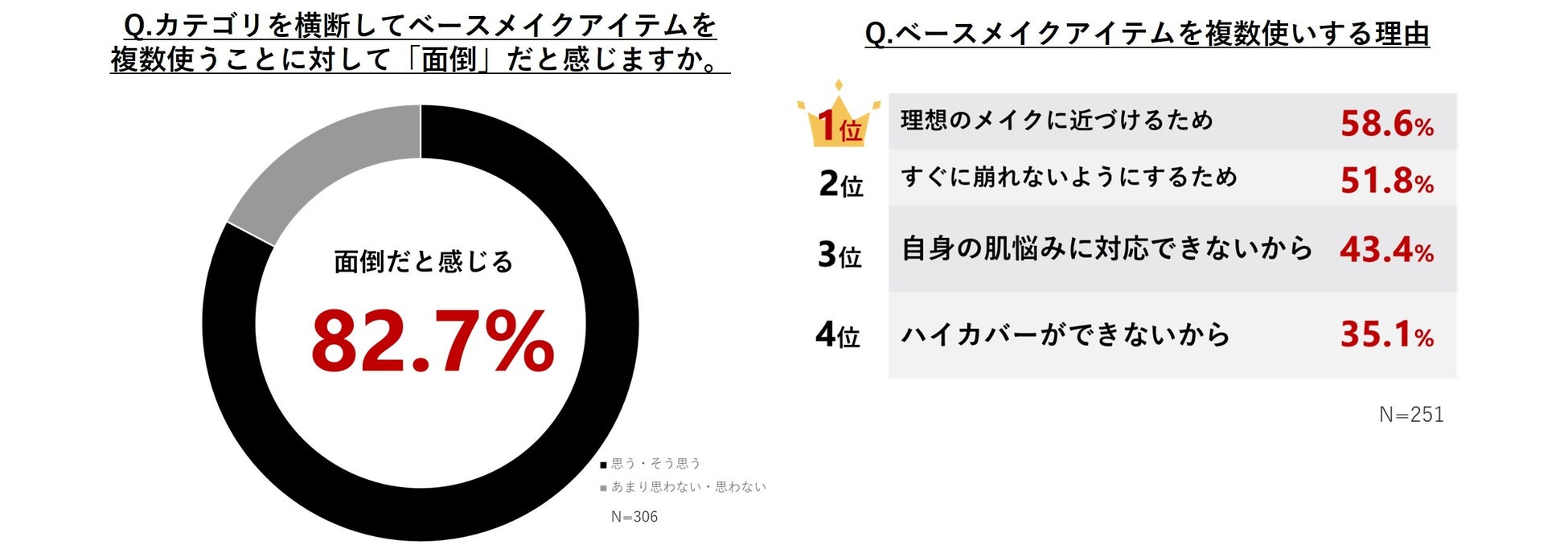 - ③約8割がカテゴリーを横断してベースメイクアイテムを複数使うことに対して「面倒」と回答。それでも複数使いしている理由として「理想のメイクに近づけるため」が最多、次いで「すぐに崩れないようにするため」という結果に。