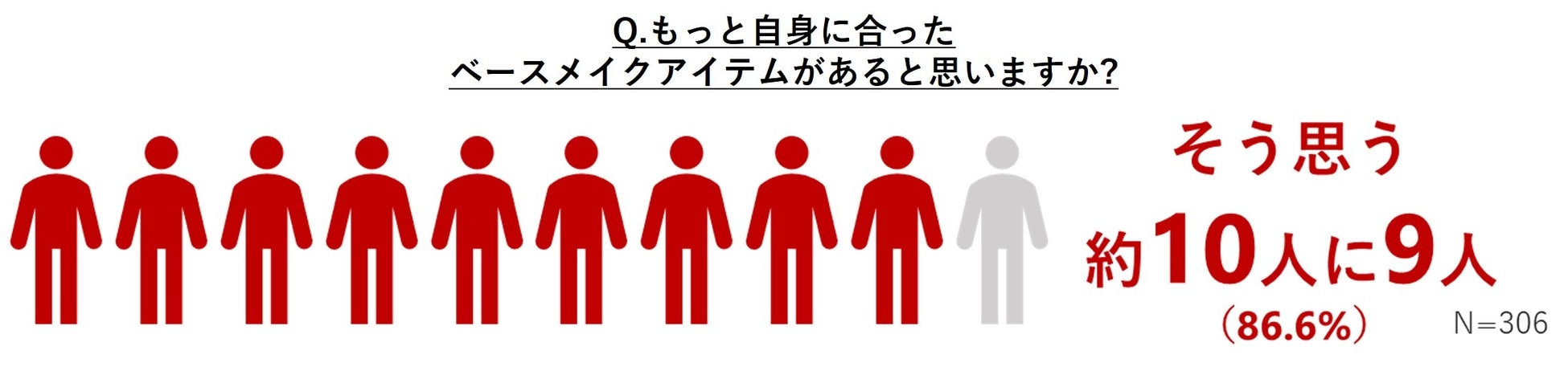 - ①約6割が自身のベースメイクに満足できていないと回答!その中でも、満足できていない理由として、「自分の肌に合っているか分からない」が約9割で最多。また、約10人に9人がもっと自身に合ったアイテムがあると思うとも回答。