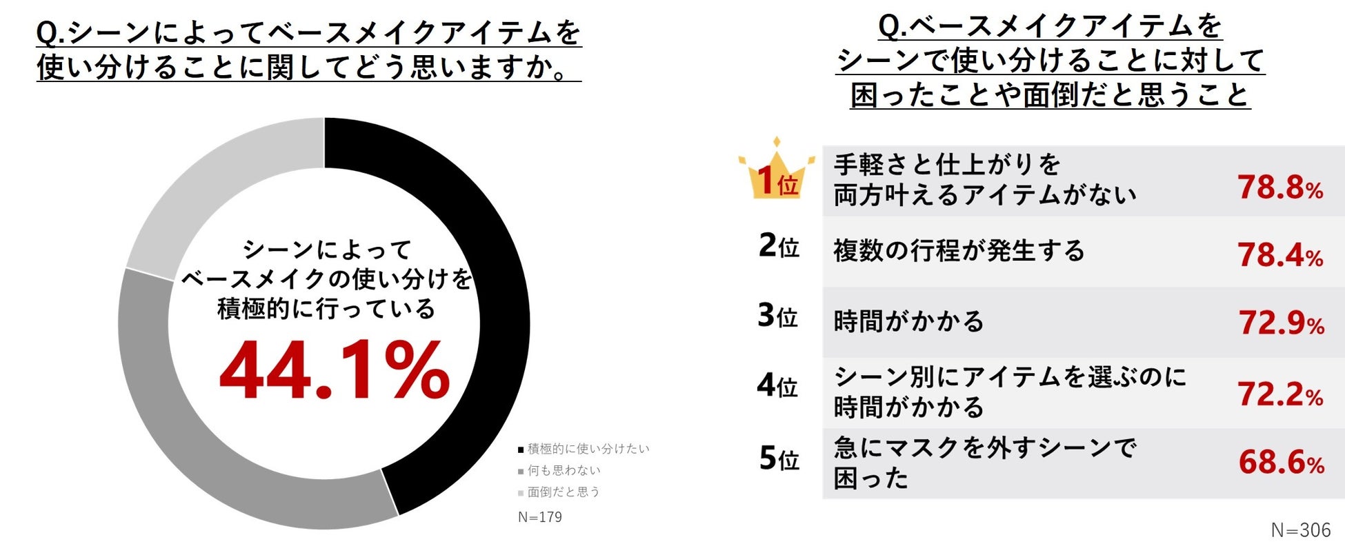 シーンに応じてベースメイクアイテムを「積極的に使い分けたい」と回答したのは44.1%と、半数以下にとどまりました。その理由として、「ベストな組み合わせを考えるのに時間がないから」が66.7%で最多、次いで「使い分ける必要がない(38.1%)」という結果になりました。また、ベースメイクアイテムをシーンで使い分けることに対して困ったことや面倒だと思うことのエピソードとして、「手軽さと仕上がりを両方叶えるアイテムがない」が78.8%が最多、次いで「複数アイテムを使用することで行程が増える(78.4%)」「時間がかかる(72.9%)」が多いということが分かりました。