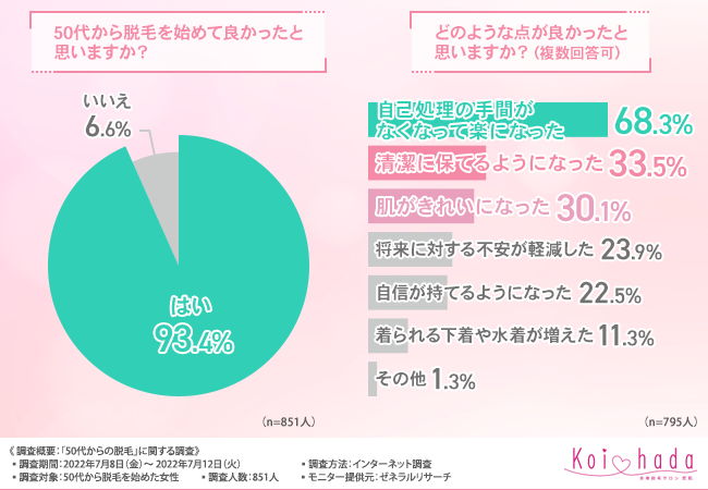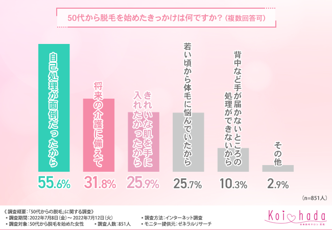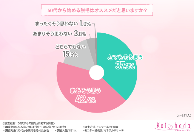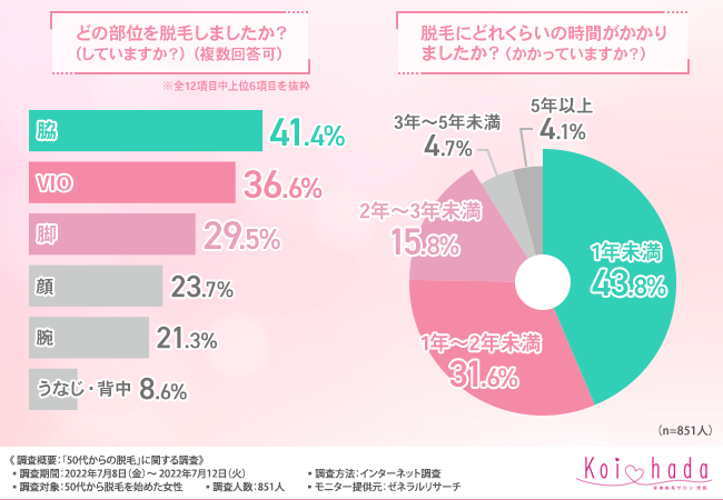 そこで今回、脱毛サロン「恋肌」(https://www.koi-hada.jp/lplj_lv/lp03/?refmedia=178)は、50代から脱毛を始めた女性を対象に、「50代からの脱毛」に関する調査を実施しました。