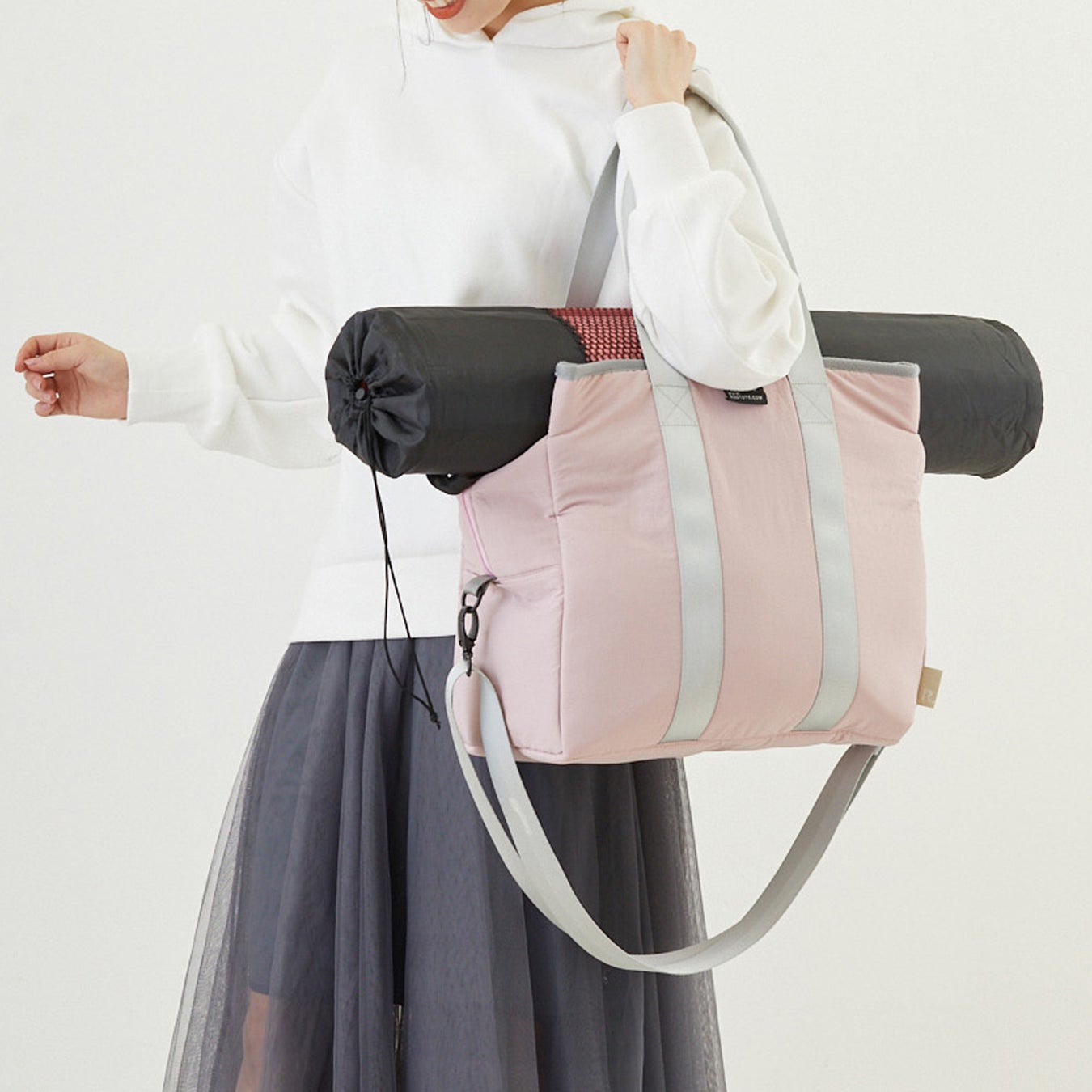 収納力たっぷりでポケット充実。自立性があり、ファスナー付きの開口部が大きく開くので、着替えやタオルなどのかさばる荷物の出し入れもスムーズです。前後についた大きなポケットに、仕事用のPCや書類と運動用の小物類など、荷物を分けて収納できます。細長いロッカーや棚に収納しやすい幅と奥行きでデザイン。シューズ用巾着や、取り外し可能なショルダーベルトが付属。内側にはボトル類にちょうどいいホルダーも付いています。ヨガマットがぴったり収まるので持ち運びも簡単です。