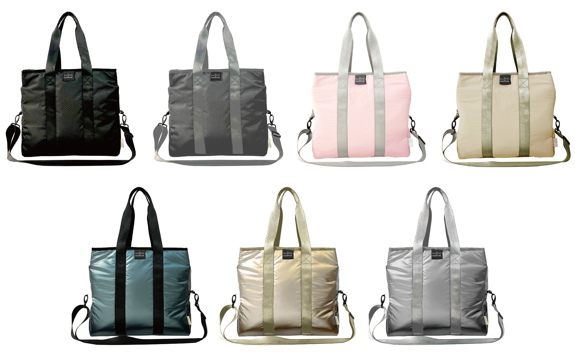 SN.グランデボックス.バランスド-A 5,720円(1422 01 Honeycomb BLACK、02 Honeycomb CHARCOAL、03 Dusty PINK、04 BEIGE、05 Shiny GREEN、06 White GOLD、07 Tantalum SILVER)サイズ:本体/W38×H34×D16cm、巾着/W32×H43cm 持ち手:55cm ショルダー:140cm 素材:表地/01、02、05、06、07 ポリエステル、03、04 ナイロン、裏地/ポリエステル、中綿/ポリエステル、マグネットホック ポケット:外側3箇所(うちファスナー付き1箇所)、内側6箇所(うちファスナー付き1箇所)、ホルダー1箇所 メイン開閉:ファスナー ※8月下旬より発売予定
