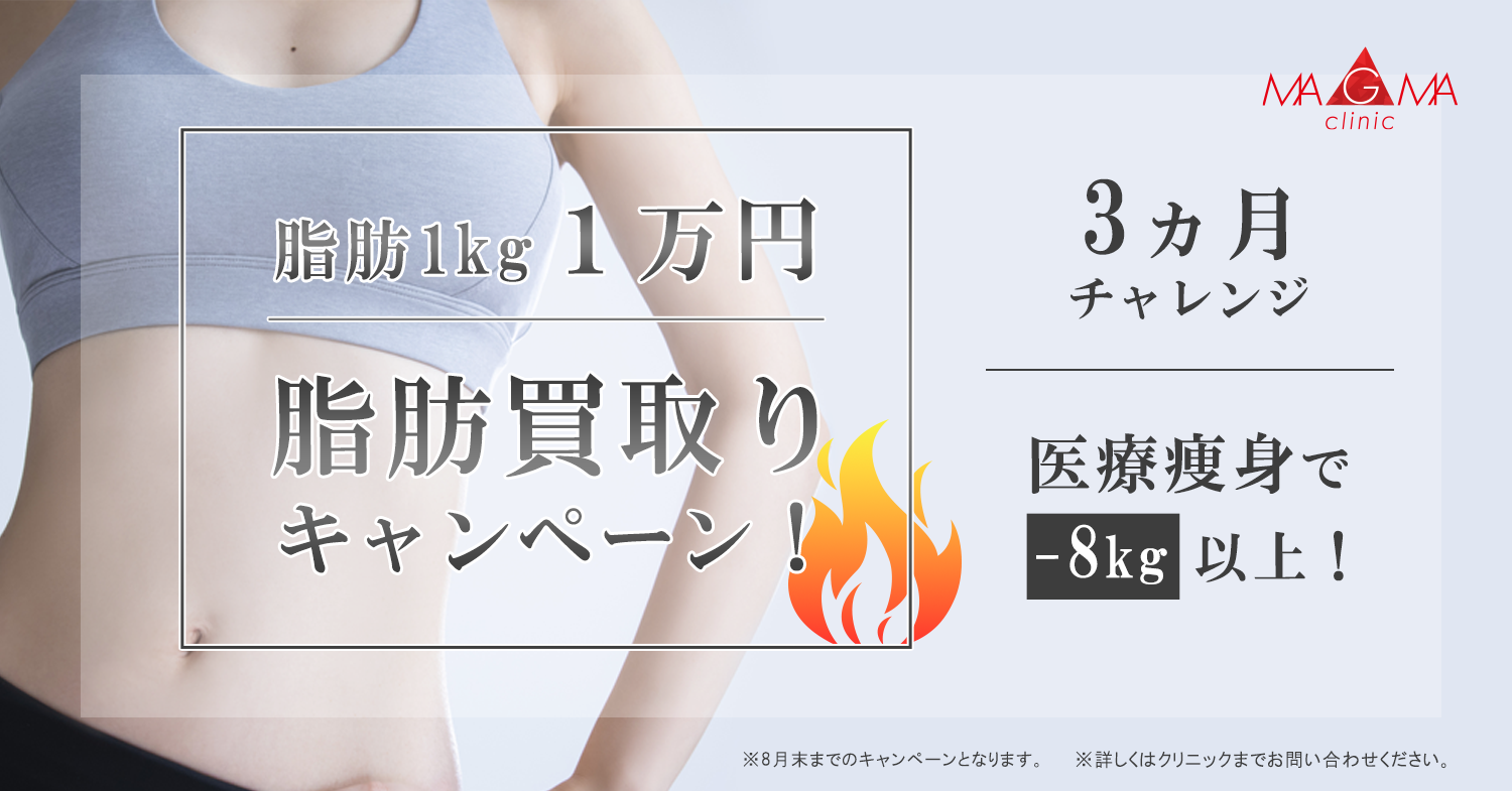 医療法人社団紡潤会(本社:東京都港区 理事長:宮内俊)は、オーダーメイドでの医療痩身治療を行うマグマクリニック表参道院にて、今年こそ痩せよう!『脂肪買取りキャンペーン』 を2022年8月1日(月)から2022年9月30日(金)まで実施します。