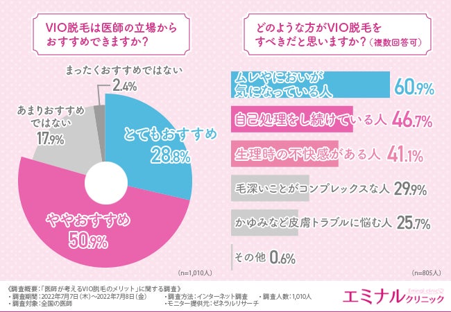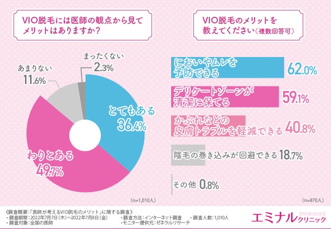 そこで今回、医療脱毛のエミナルクリニック(https://eminal-clinic.jp/lp01/?refmedia=11073)は、全国の医師を対象に、「医師が考えるVIO脱毛のメリット」に関する調査を実施しました。