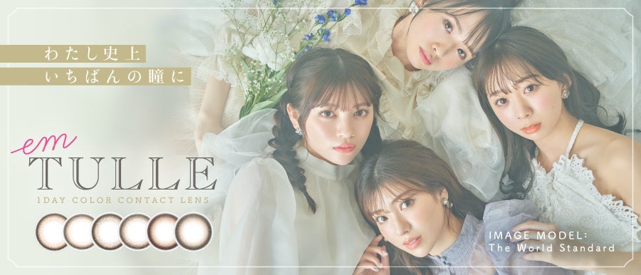 『em TULLE』は、“わたし史上いちばんの瞳に”をコンセプトにしたカラコンブランドです。瞳に馴染み立体感を演出するこだわりのレンズデザインと透明感を引き出す絶妙な配色で、“ちゅるん”としたかわいらしい瞳になれると発売以来ご好評をいただいております。