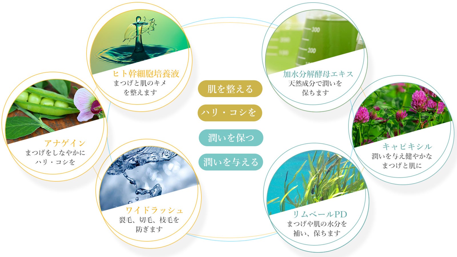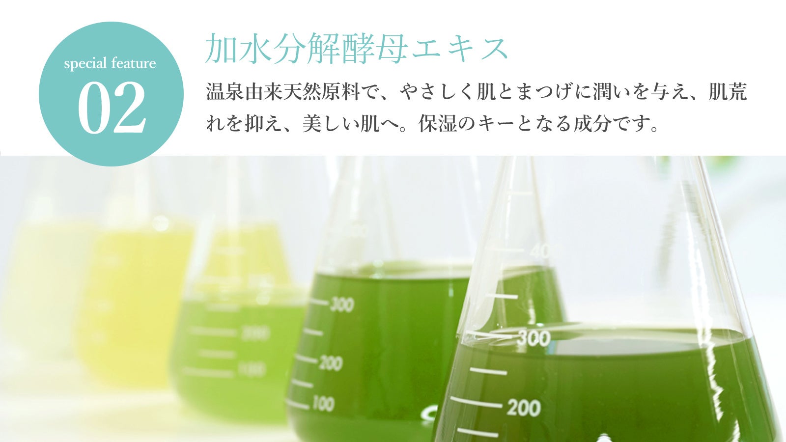 まつげに「ハリやコシ、潤い」を与えること、更に、まつげの土壌となるまぶたへの最適なアプローチをするために、培養の仕方を徹底的に研究した濃度の高いヒト由来幹細胞順化培養液を使用しております。また、温泉微生物由来の成分「加水分解酵母エキス」は、本商品の開発研究機関であるSARABiO温泉微生物研究所が、天然成分の世界基準”エコサート”に登録原料として認定された、本物のナチュラルコスメ原料です。なお、SARABiO温泉微生物研究所の加水分解処理された「低分子化されたコラーゲン」は、効率よく角質層を保湿します。