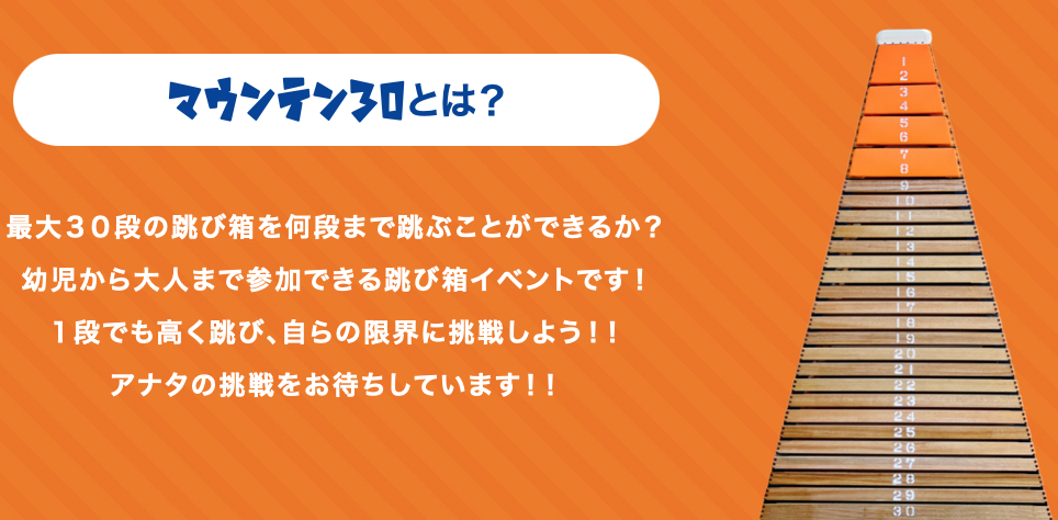 子ども向け総合スポーツクラブであるオールアルビレックス・スポーツクラブでは、「マウンテン30」という名称で、最大30段の跳び箱をイベントを開催することとしました。