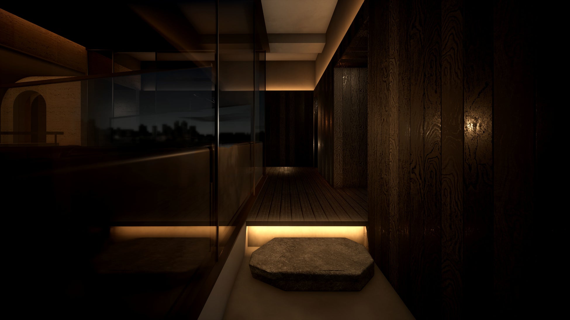 また、暖炉の火が煌めく幻想的な空間となっています。プライベートサウナエリアは広くゆったりとした寸法で計画し、ゆったりと「ととのう」ことのできる空間としました。