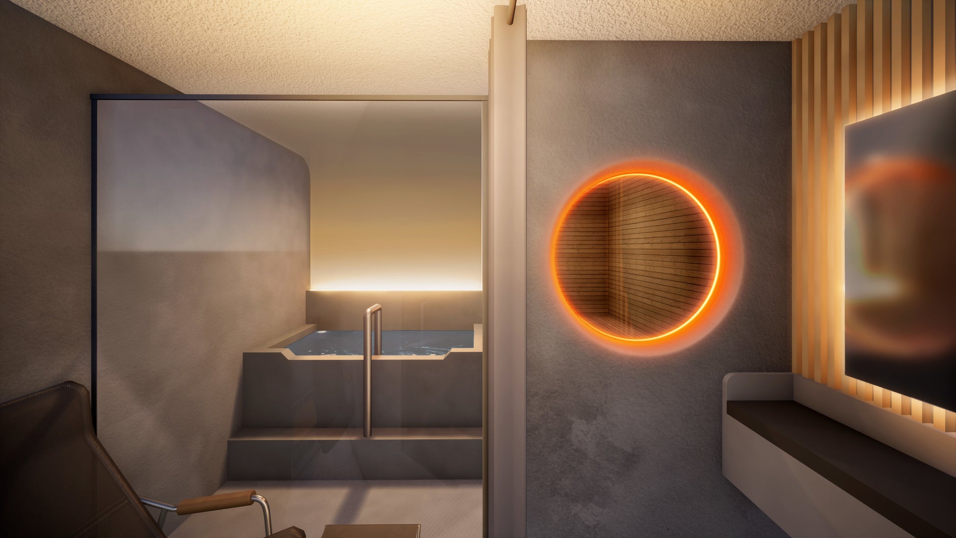 プライベートサウナエリアは、着替えスペース、サウナ室、水風呂、ととのいイス、全てが誰にも邪魔されないあなただけの空間です。