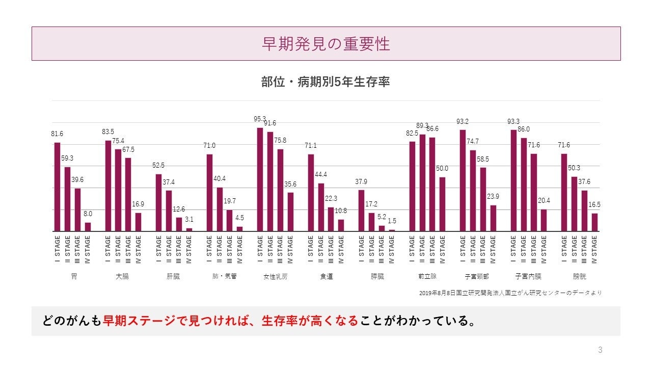 特にステージの早い段階で見つけても、生存率が短いがん場合の意味は、非常に大きいと考えております。