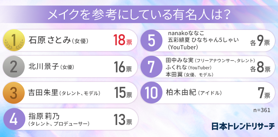 今回は、美容メディア『amy』と共同で、「有名人のメイクを参考にすることがある」と回答した全国の女性361名を対象に、「メイクを参考にする有名人」についてアンケートを実施しました。