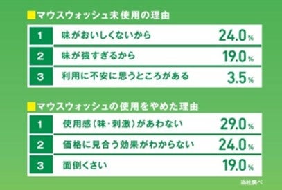 また、マウスウォッシュをまだ使ったことの無い方や、使っていたけれども途中でやめてしまったという方への調査を実施すると、「味がおいしくない」「刺激が合わない」といった使用感への課題が大きな理由であることが改めて明確になりました。*³