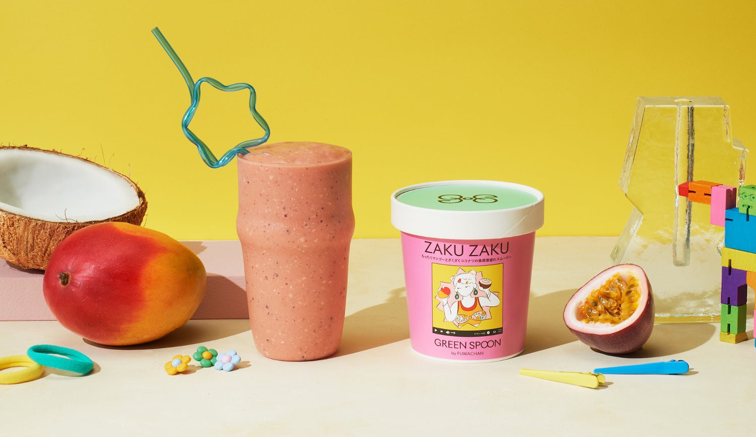 実は2020年のGREEN SPOONローンチから、2年3ヶ月以上にわたってスムージーや野菜スープを愛用しているフワちゃん。試食をかさね、こだわりを詰め込んだハッピーな2種類のスムージーが誕生しました。