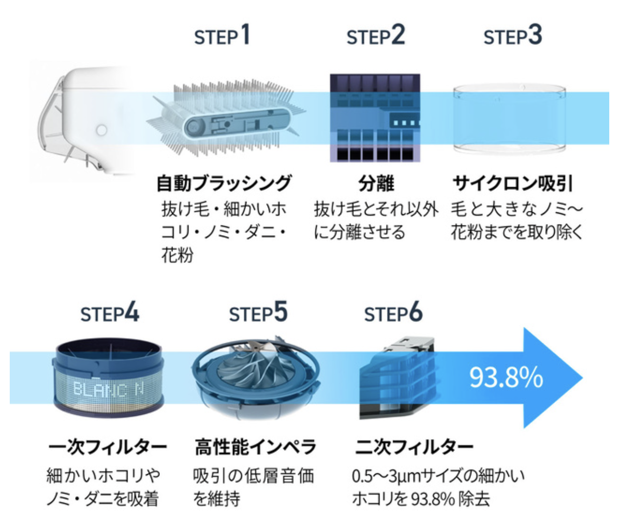 6段階のステップでペットに付着するノミ〜花粉までを93.8%取り除きます。