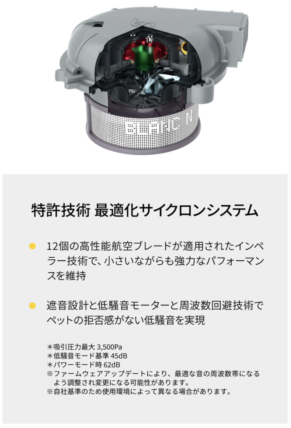 ■強力な超小型サイクロン技術と低騒音技術で「ペットが怯える問題」を解決
