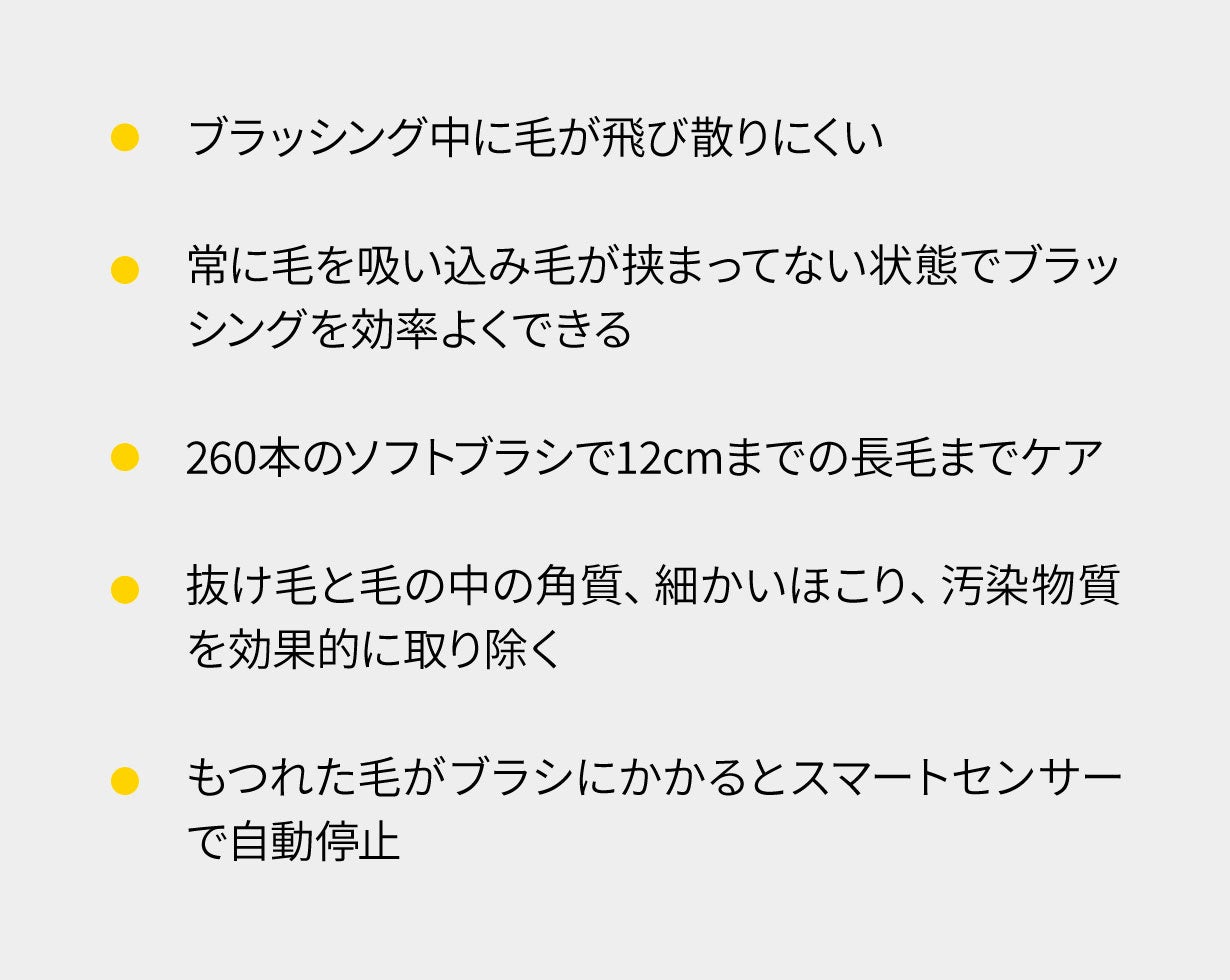 260本のソフトブラシは優しくなでるように抜け毛と汚染物質を取り除きます。