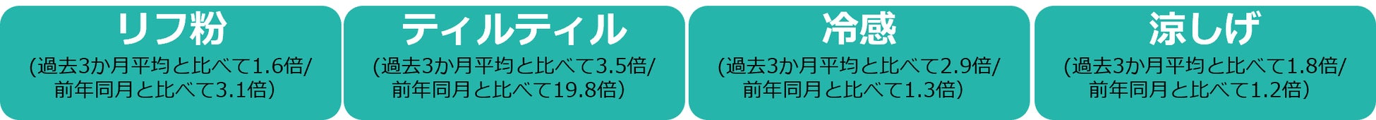 ベタつきを解消するアイテムとして、肌をサラサラに保つパウダーへの注目も高まっています。ベビーパウダーやイニスフリーのパウダー、「鉄壁パウダー」と噂される韓国ブランド「スーンプラス」のパウダー等、いろいろな製品が話題になっていますが、6月はタイの人気No.1フェイスパウダーブランド「SRICHAND(シーチャン)」や通称“リフ粉”とも呼ばれるNARSの大人気フェイスパウダー「ライトリフレクティングセッティングパウダー プレスト N」が話題になりました。また、気温と湿度があがると汗や皮脂の分泌量も増えるので、「ウォータープルーフタイプ」というワードが増加したりと、汗皮脂に強いコスメも話題に。崩れにくいと人気の「ティルティル」のクッションファンデは、この夏ますます話題を集めそうです。その他にも暑さを解消するひんやり系、涼しげなパッケージや香り、色味などへの関心も増加するなど、環境の変化はクチコミにダイレクトに影響しているのがわかります。