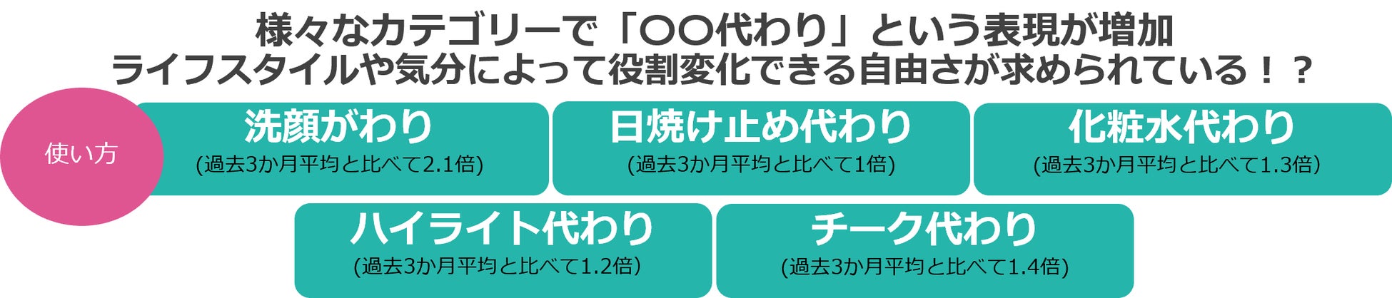 まだまだ出現件数は非常に少ないですが、様々なカテゴリーで「〇〇代わり」という表現が増加しています。1つの商品がいくつもの役割を果たすマルチ化が進んだことによって、同じ化粧品であっても”ライフスタイルやその時の気分”によって役割を変えることができる自由さが求められているのかもしれません。