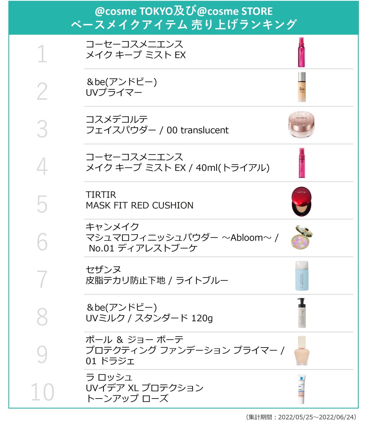 すでに暑い日が続く今、外出時に気になるのは、汗や皮脂によるベースメイクの崩れ。そこで、今回は@cosme TOKYO及び@cosme STORE全館のベースメイクアイテムの売り上げランキングを紹介いたします。1位にランクインしたのは、ファンデーションやフェイスパウダーでもなく、化粧くずれを防ぐミストスプレー!同商品のトライアルサイズも4位にランクインしています。ウォータープルーフ効果、皮脂くずれ防止効果に加えて、マスク着用によるメイクのヨレ防止し、マスクにメイクが付きにくくなるなど、この夏にぴったりな商品です。その他には皮脂のテカリを防止してくれる化粧下地や”最大72時間維持するファンデーション”と謡ったクッションファンデがランクイン。また、ミストスプレーと3位のフェイスパウダー以外は、すべてUV効果のある商品がランクインしているなど、夏の要素が反映されたランキング結果となりました。