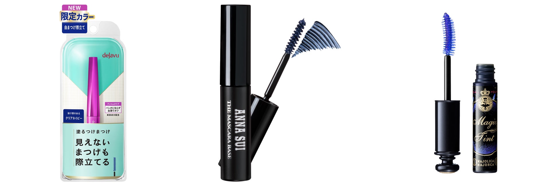 (左から)デジャヴュ塗るつけまつげ ラッシュアップ/クリアネイビー、アナ スイ コスメティックス ザ マスカラ ベース、マジョリカ マジョルカ マジックティント