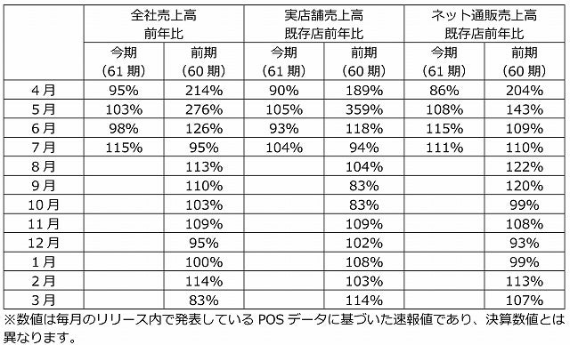 GINZALoveLoveは、アプリ会員を中心に1to1プッシュ通知や顧客へのデータマーケティングの展開を行ってまいりました。7月度は、商業施設を中心に集客力が高まっていることで客単価の伸び悩みはあったものの、前月に続いて購入客数が前年を超える水準となりました。この結果、実店舗の既存店前年比104%という実績となり、全社の前年比が115%という結果になりました。