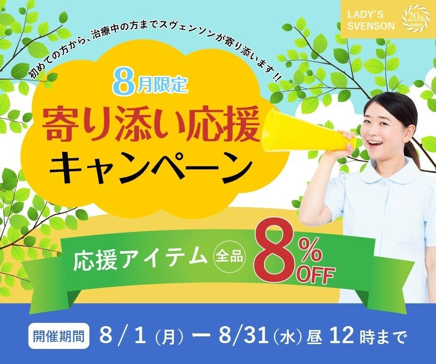 今回のキャンペーンでは、「治療前~生え戻りまで」その時々に必要なケア商品を安心してご利用いただけるよう、「Lady’s SVENSON STORE」内にて応援セットのアイテムを全品8%OFFにてご提供します。さらに、新規未購入の方には会員登録で500円OFFクーポンを配布し、金額面でもサポートして参ります。