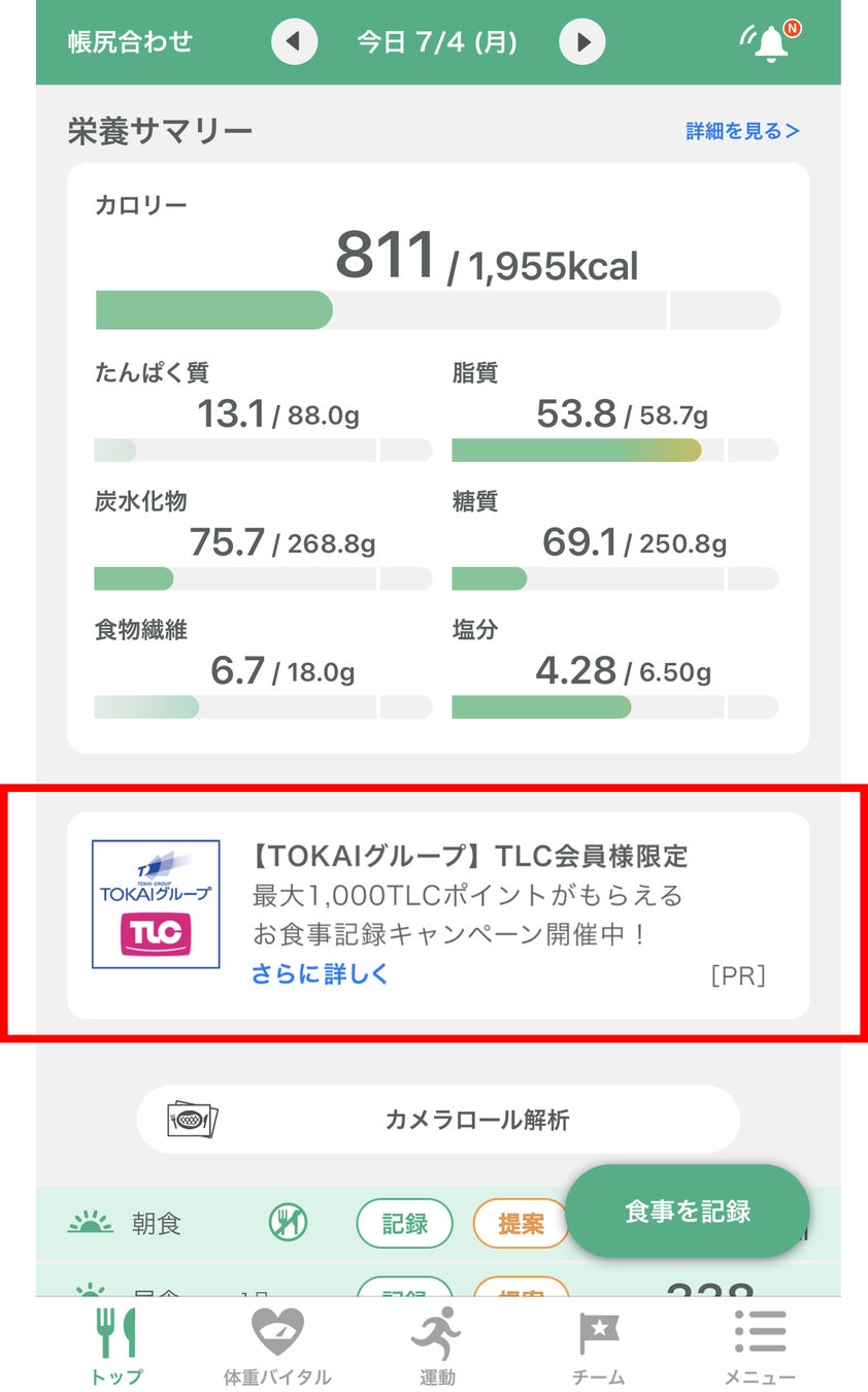 特典3 キャンペーン全期間の食事記録で300TLCポイント付与(キャンペーン全期間の食事を記録した場合)