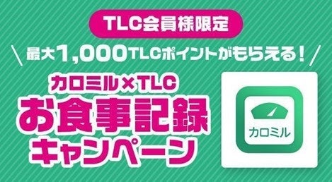 食事・運動・体重管理アプリケーション(以下、アプリ)「カロミル」の開発・提供を行うライフログテクノロジー株式会社(東京都中央区、代表取締役:棚橋繁行、以下「当社」)は、株式会社TOKAIホールディングス(静岡県静岡市、代表取締役社長:鴇田勝彦、以下「TOKAI ホールディングス」)が運営する「TLC会員サービス」の会員(以下、「TLC会員」)に向け、「カロミル」とのデータ連携を行うことで最大1,000TLCポイントがもらえる「カロミル×TLC お食事記録キャンペーン」が開始されましたことをお知らせいたします。