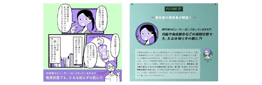 また、物語を通して、「一瞬でなりたい自分になる第二の皮膚」「100%自然に還る、環境に良いコスメ」をはじめとした、資生堂の未来予測に基づく50年後のビューティートレンドや美容アイテムを紹介します。更に、物語に登場するビューティートレンドや美容アイテムの関連コマをクリックすると、資生堂研究員からの解説コメントが表示され、より具体的に美の未来を知ることができます。また、未来のビューティートレンドの予測に基づき、その兆しとなる現在の資生堂各ブランドアイテムを紹介します。