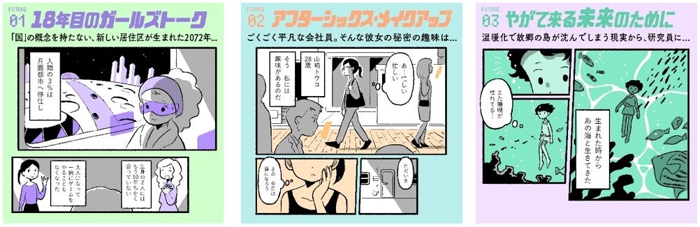 第二弾のメインコンテンツとして、イラストレーター・アニメーション作家の北村みなみさんが未来を予測して描き下ろした、資生堂オリジナルの近未来ビューティーコミック全3話を公開します。本コンテンツでは、資生堂が思い描く「50年後のビューティー」をテーマに、2072年の未来で生活する人々の日常が描かれています。