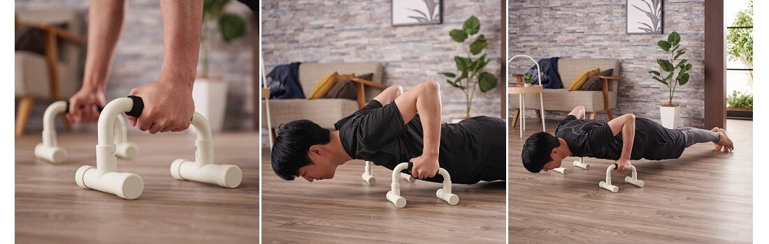 高い負荷をかけることができる“ハイタイプ”と、初心者の方でも気軽に鍛えることができる”ロータイプ”の2モデルをご用意しました。前後で高さの異なる傾斜ハンドルを採用することで、手首への負担を抑えます。手にフィットして、しっかりと握ることができるソフトグリップ、使用中に滑りにくく、床を傷つけにくいゴムパーツを採用するなど、リビングなどで安心してご使用いただける設計です。目立たず、お部屋に馴染みやすいグレーおよびライトグレーを採用しています。