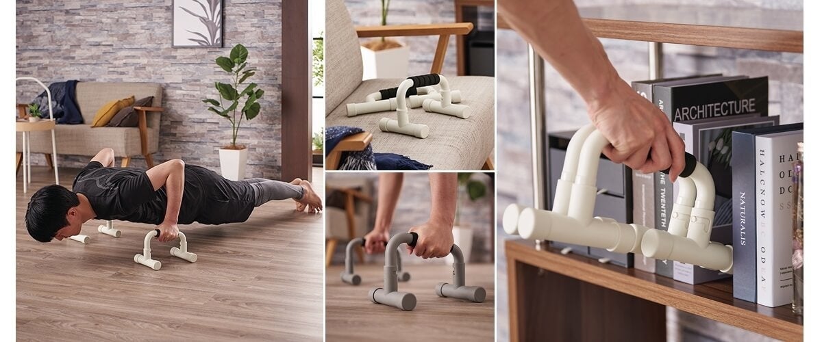 お家のリビングなどで気軽にトレーニングが可能なエクリアスポーツシリーズの“折りたためるプッシュアップバー”です。最大の特長は、使わないときにベースを回転させることで、わずか幅約6cmのスリムサイズになることです。これなら置き場所に困らず、お部屋のちょっとしたすき間に保管しておくことができて邪魔になりません。