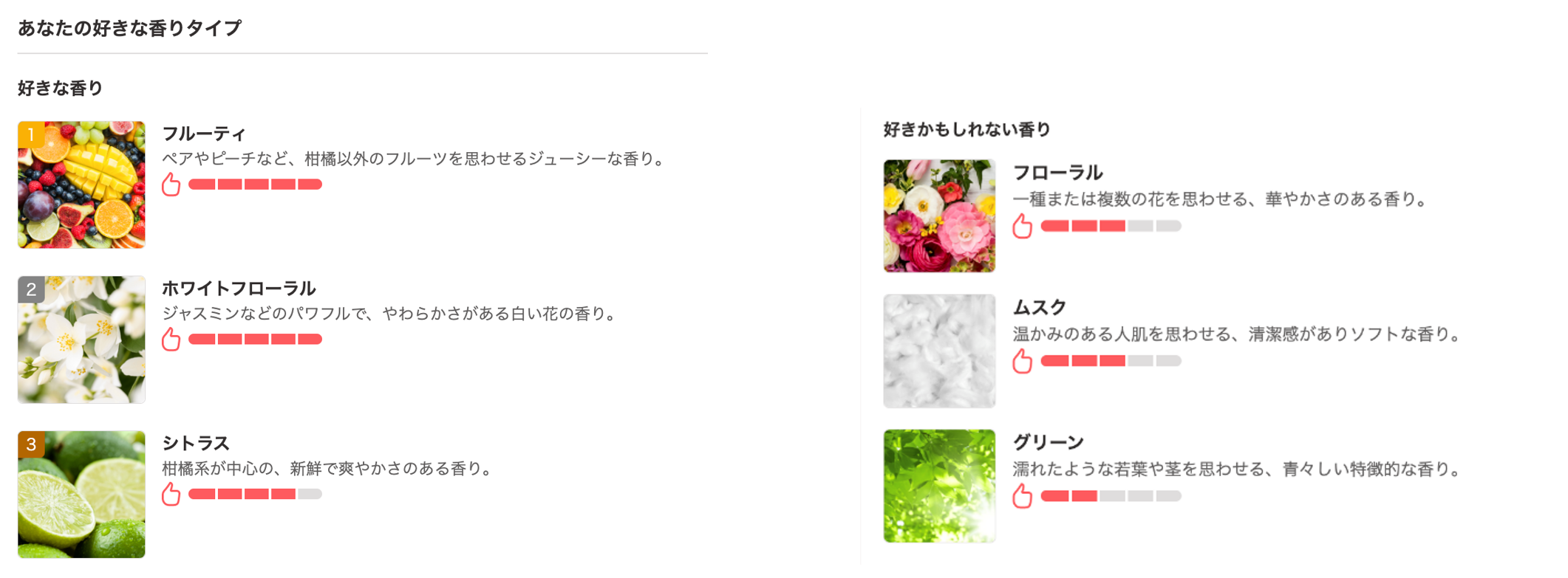 また、香料をクリックすると、その香料が含まれている香水も表示されるようになるため、具体的にどの香水が好みに近いか分かるようになり、香水選びを行いやすくなっております。