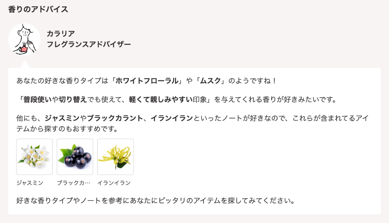 従来はお客様の香りの好み度合いをチャートで表しておりましたが、フレグランスアドバイザーに接客されているかのような体験で、より香りの好みが分かりやすくなっております。