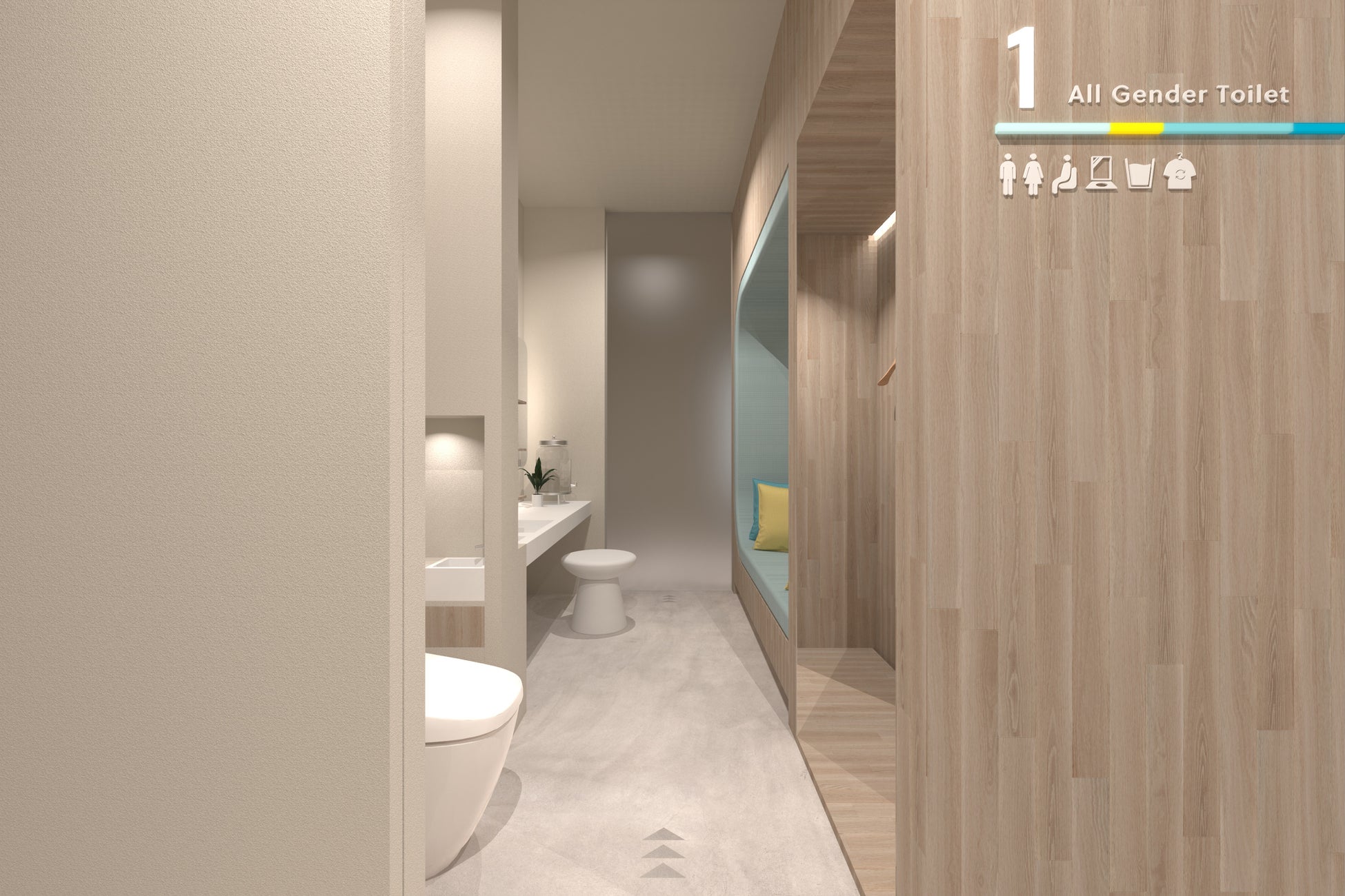 オールジェンダートイレとは、性別に関係なく使用できる全く新しい形のトイレです。今回注力したのは「気まずさの解消」。性別関係なく次に使用する人と顔を合わせた際に、気まずさを感じたことがある方は多いのではないでしょうか?オールジェンダートイレは、次に使う人と顔を合わせることが無いよう、入口と出口を分けた一方通行型のトイレです。「セルフメンテナンス」機能も付加しています。トイレはオフィスで一時的に独りになれる唯一のスペースです。オールジェンダートイレでは、体調や気分のメンテナンスをできるよう、立つ・座るだけでなく、横になることも可能です。