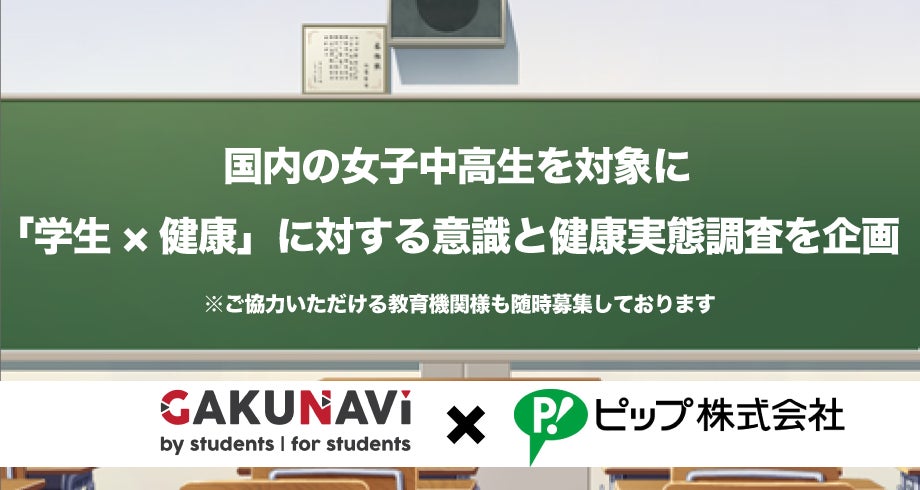 そこで、学生のリアルな声を調査することを得意とするGakuNaviは、長年人々の身心の健康に寄り添ってきたピップ株式会社と共同で、学生がより自分らしく学生生活を満喫できるようにサポートすることを目的として、女子中高生を対象に健康実態調査を実施します。
