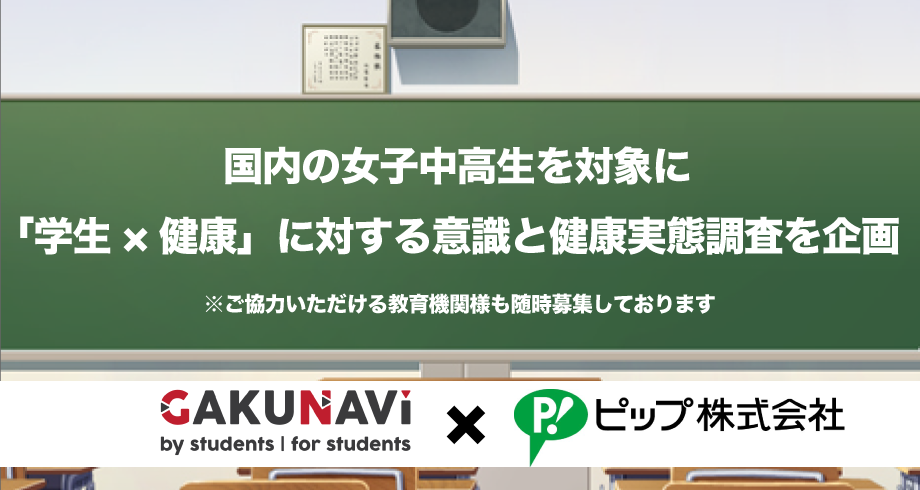 そこで、学生のリアルな声を調査することを得意とするGakuNaviは、長年人々の身心の健康に寄り添ってきたピップ株式会社と共同で、学生がより自分らしく学生生活を満喫できるようにサポートすることを目的として、女子中高生を対象に健康実態調査を実施します。